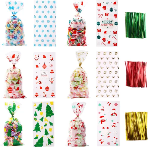 Paquete de 120 bolsas de celofán de Navidad con etiquetas de Navidad, calcomanías para bolsas de regalo, Bolsas de galletas de Navidad, bolsas de caramelo de celofán de Navidad, Bolsas de regalo de Navidad, bolsas de regalos de vacaciones y recuerdos de fiesta de Navidad Especificaciones: Cantidad: 120 piezas Material: material de Opp Tamaño: 10.6 x 5.1 pulgadas. Diseño: 6 estilos diferentes Elemento: Tema de Navidad El paquete incluye: 120 bolsas de celofán. 150 x corbata torcida